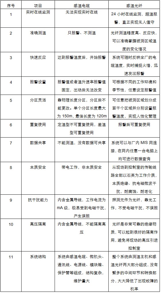 表1:感溫電纜與感溫光纖的性能對比