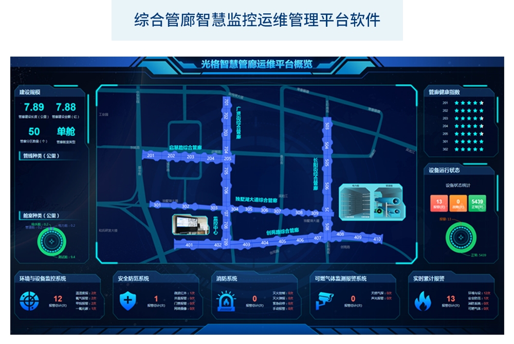 資產(chǎn)3M(Monitoring, Management, Maintenance)一體化,系統設計高于GB/T 51274-2017《城市綜合管廊監控與報警系統工程規范》及GB51354-2019《城市地下綜合管廊運行維護及安全技術(shù)標準》相關(guān)要求,提供管廊資產(chǎn)管理、環(huán)境監控、安防監控、結構健康監測、智能聯(lián)動(dòng)、報警管理、排班管理、運維管理、備品備件管理、經(jīng)營(yíng)管理、應急輔助決策、管廊健康狀態(tài)評估分析、移動(dòng)應用等功能,幫助監控運維人員實(shí)時(shí)獲取管廊環(huán)境、安防、結構健康等多維度信息,系統化開(kāi)展管理日常運維運營(yíng)工作。